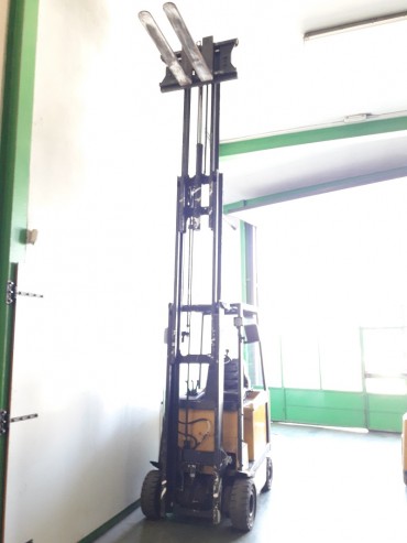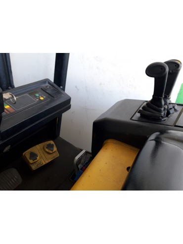 Carretilla elevadora eléctrica Yale mod. ERP 16 AAP E2130/ ocasión, dispone de cinturón de seguridad obligatorio, faro destellante y avisador acústico para señalizar el movimiento de la carretilla, ruedas súper elásticas macizas para soportar mejor el peso de la carretilla elevadora, con un mástil triplex 4950mm, con elevación libre, desplazador lateral, espejo retrovisor, .